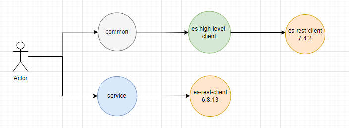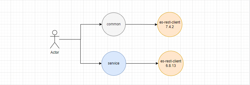◦实例验证: 针对该原则的验证场景构造不再关注模块是否直接或者间接引用不同版本的es,我们在common模块和service模块中都直接引用不同版本的es,然后通过改变两个模块在pom文件中声明的先后顺序来观察项目启动后实际加载的jar包;