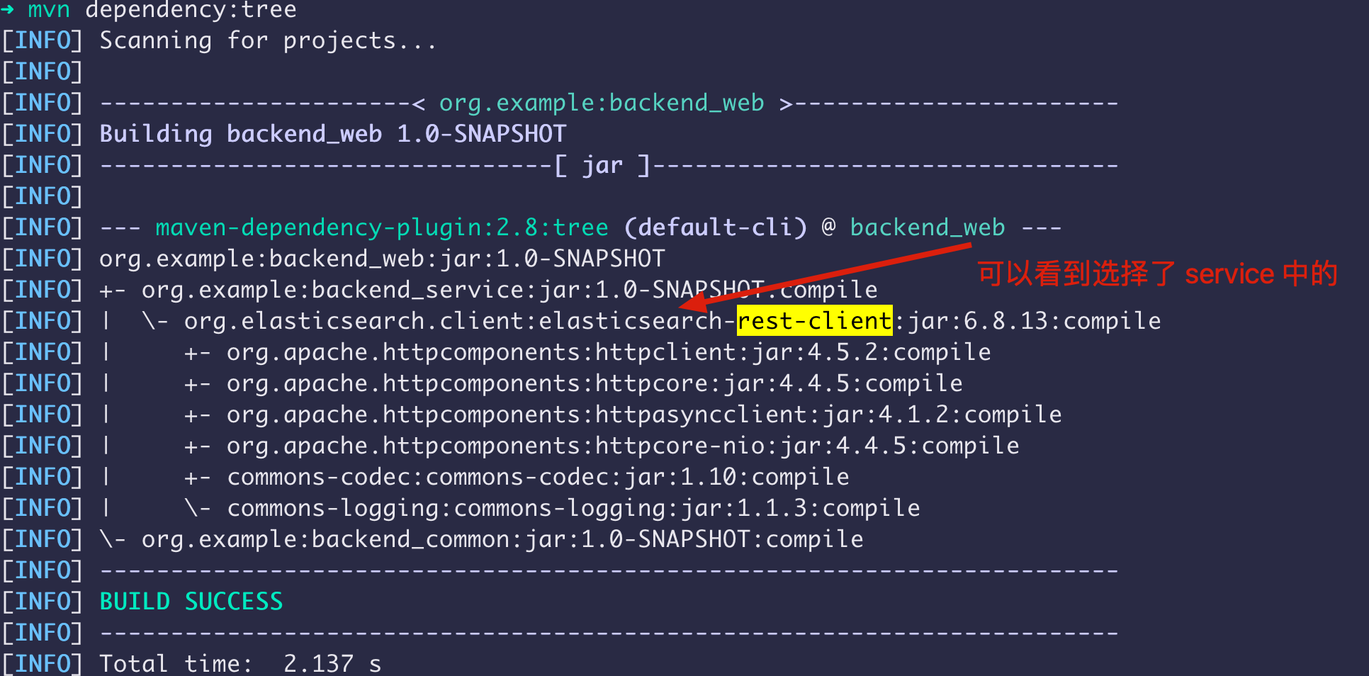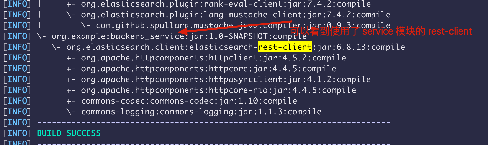 ▪service模块: 为了验证不同路径长度下maven的包加载顺序 , 我们在service模块中直接引入elasticsearch-rest-client 6.8.13;