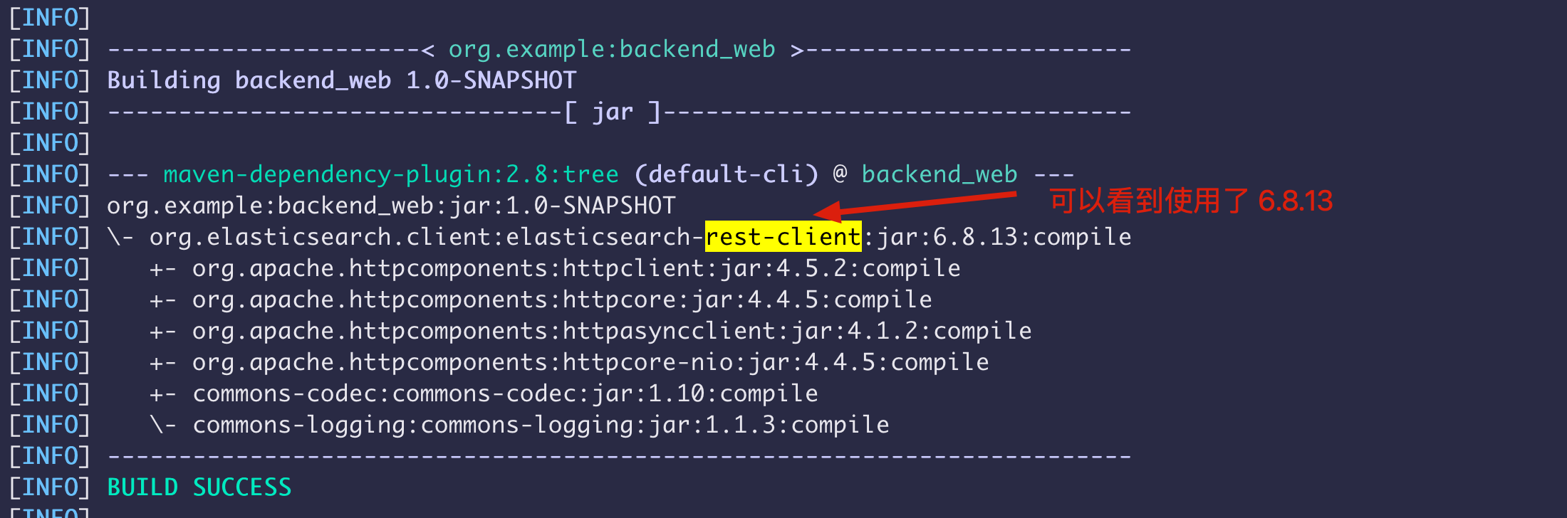 ▪mvn dependency:tree: 我们可以通过mvn dependency :tree命令来查看该项目的依赖树,观察发现实际加载的版本是elasticsearch-rest-client 6.8.13,符合maven中的最短路径优先原则;