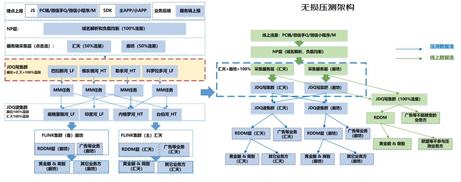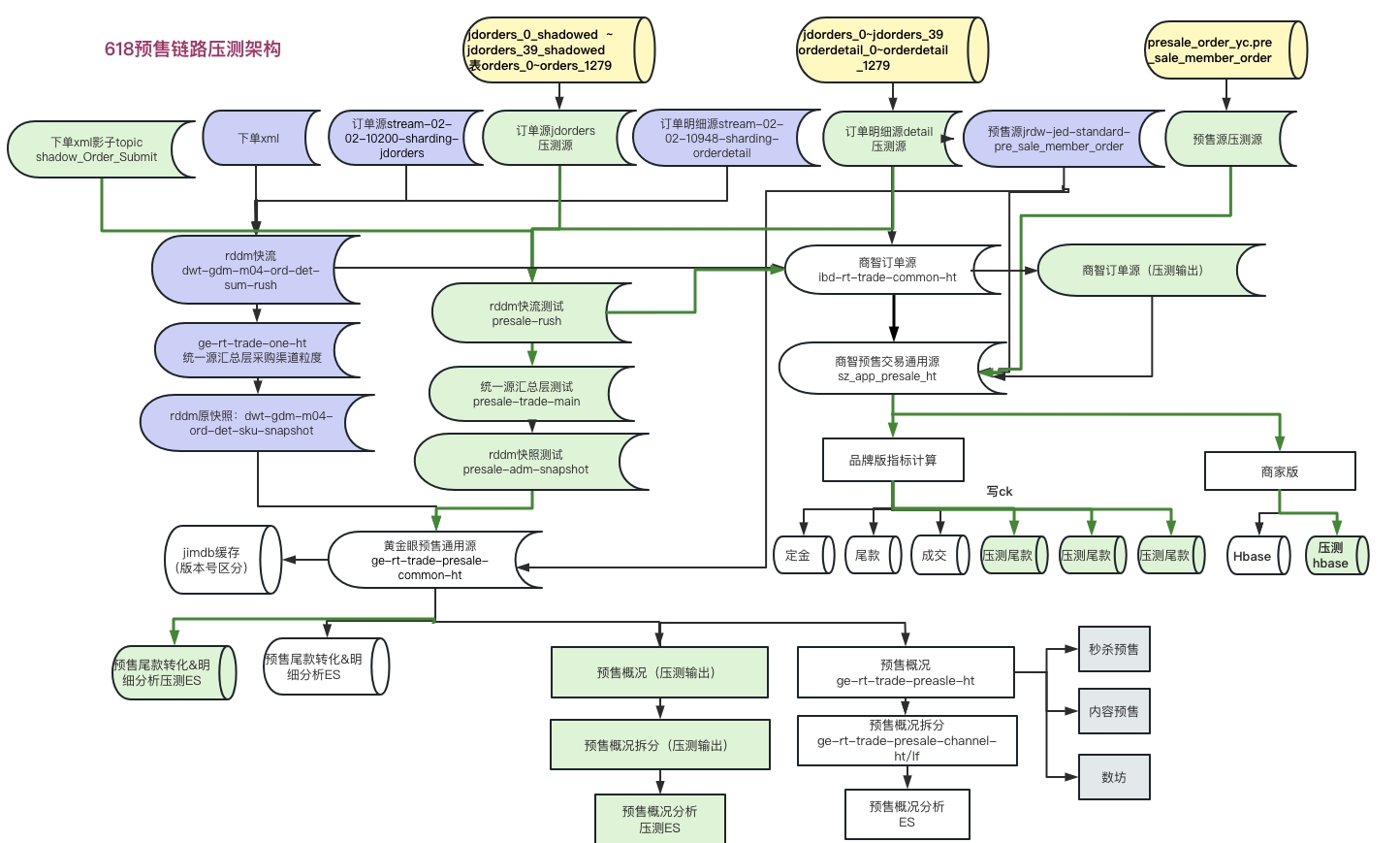 如下图所示: 黄色部分为在线军演提供数据的对应存储——影子库表 。绿色部分为压测新增,最上层为压测数据源(JMQ/JDQ) ,下面是为了压测搭建的透传压测环境以及写影子存储。黄金眼预售通用源和商智预售交易通用源对应任务改成双进双出,同时可以处理线上数据源和压测数据源,线上数据写入线上输出topic和线上存储。 压测数据源的数据处理后输出压测数据的topic,写入影子存储。这样线上拓扑不用随着每次压测改动,同时,下游业务方也可以灵活选择是否参与压测。
