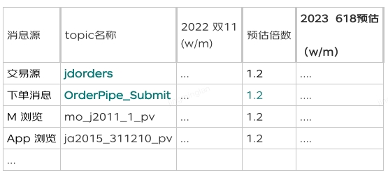 (1) 压测目标设定,一般会参照历史峰值和市场预估,给出核心交易、流量主题链路峰值预估,例如22年双11的1.2倍。关键的数据流topic,会给出预估消费峰值供下游参考,如下表格所示(数据涉及保密不做详细展示)