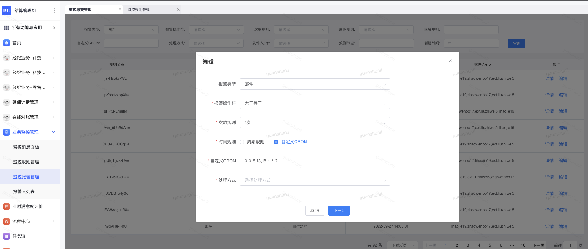 报警引擎是指配置报警的一系列的规则,数据计算的规则,触达的方式。创建好规则后,要对每一个规则进行详细的报警配置,包括触发报警的类型,报警规则,操作阈值,处理方式等。(图8)报警类型指触达方式,继承了保险SaaS-msg的能力,支持邮件、内部聊天工具、微信、电话等触达方式。任务系统使用Easy-Job来动态管理任务。处理方式可以对接业务方Jsf 来完成闭环,也可以设置成归档,以便后续的有导出或对数的需求。