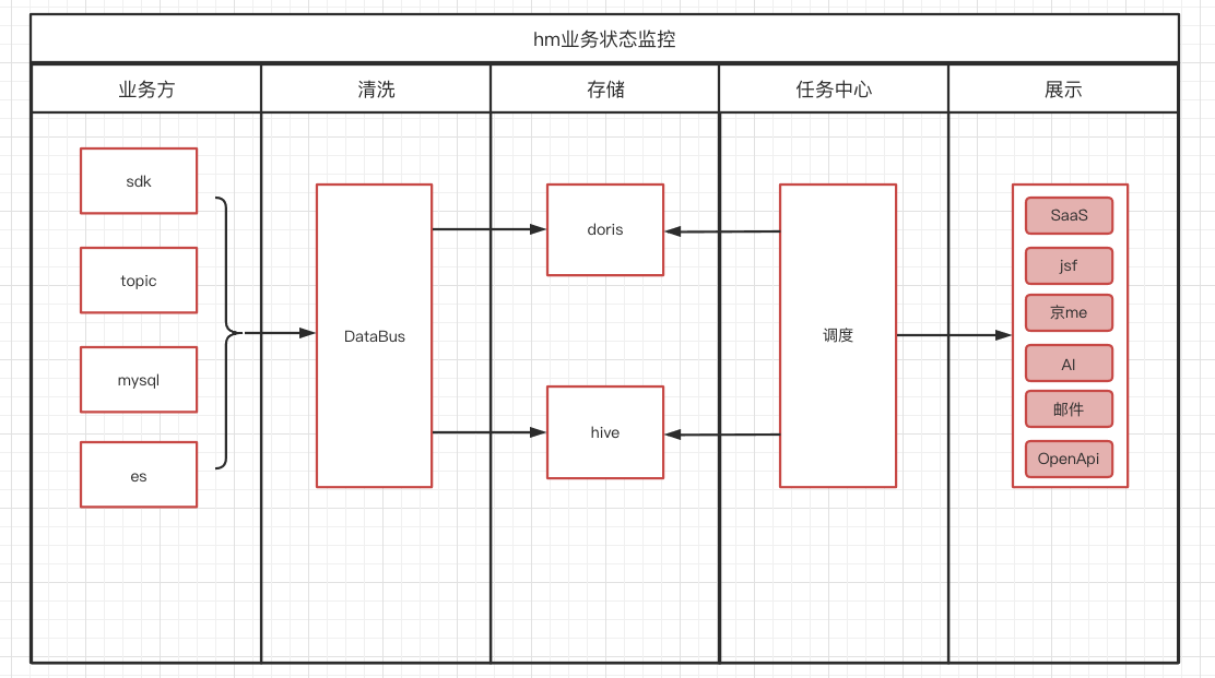 hm的主要职责在业务数据的归纳、分拣。除了埋点接入外还支持,mq、数据库等数据源的接入。所有的数据统一有集团的DP(DataPilot )平台的DataBus系统的DTS完成,统一进数仓的FDM/BDM层。再由集团的调度中心Buffalo(EMR),配置的spark任务执行数据分拣。最终数据进入doris/hive/es中存储。