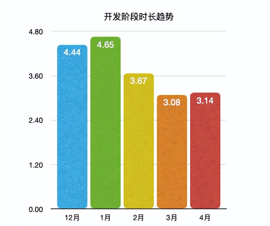 2023/1月落地后,开发阶段时长缩短到 4天 以下(由 4.54 缩短至 3.11,缩短约31%),呈明显缩短趋势!