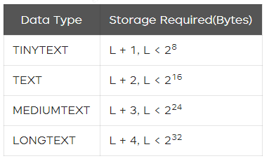 message列保存的是接口交互报文内容,定义的类型是 TEXT,它还有一些相关的类型,具体如下(L代表字符串的字节长度,数字表示存储字符串字节长度的字节数):