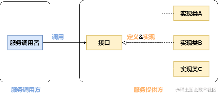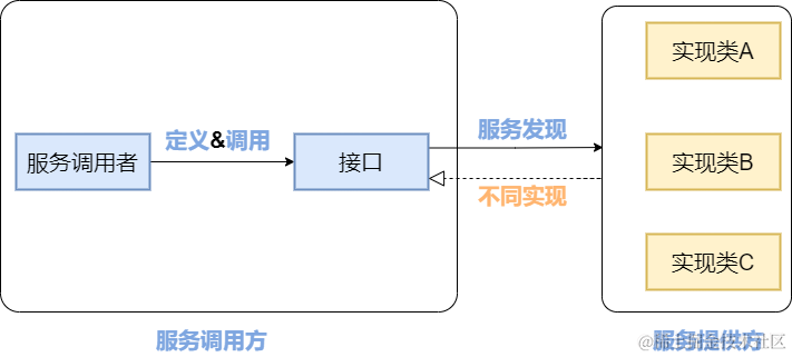 如果我们将接口的定义放在调用方,服务的调用方定义一个接口规范,可以由不同的服务提供者实现。并且,调用方能够通过某种机制来发现服务提供方,通过调用接口使用服务提供方提供的功能,这就是SPI的思想。