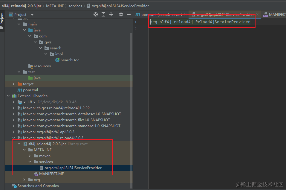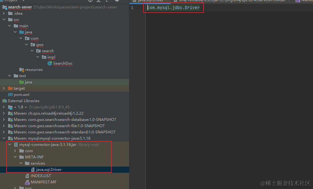 接下来关键的一步就是服务发现,服务发现需要依赖ServiceLoader的使用。创建一个新项目search-sever,引入上面打好的两个提供方的 jar 包。