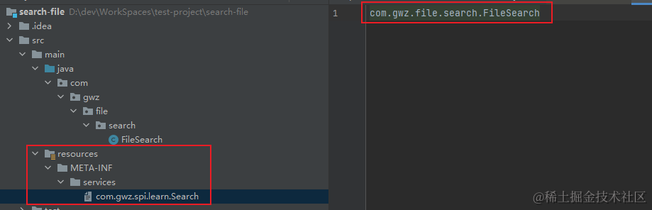 并在项目的resources的目录下,创建META-INF/services目录,然后以前面定义的接口名com.gwz.spi.learn.Search创建文件,并在文件中写入实现类的全限定名。