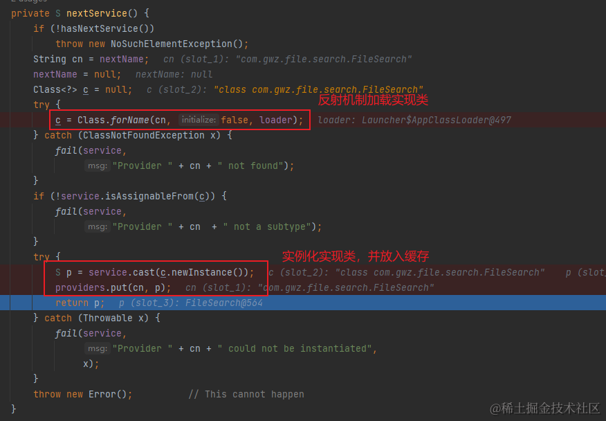 接下来,在nextService()方法中,则会通过上述解析到的实现类全路径名加载这个实现类,然后实例化对象,最终放入缓存中去。
