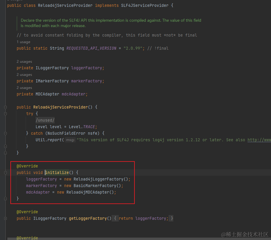 jar 包的META-INF.services里面,通过 SPI 注入了Reload4jServiceProvider这个实现类,它实现了SLF4JServiceProvider这一接口,在它的初始化方法initialize()中,会完成初始化等工作,后续可以继续获取到LoggerFactory和Logger等具体日志对象。