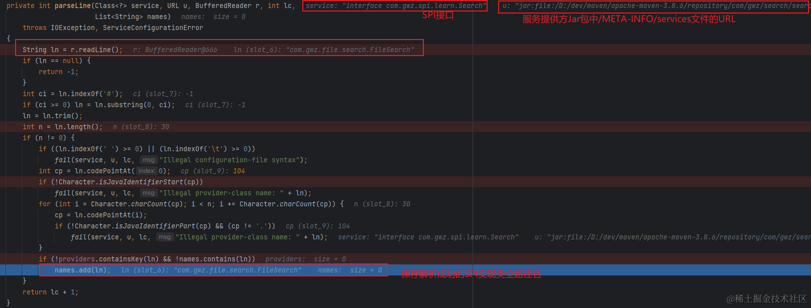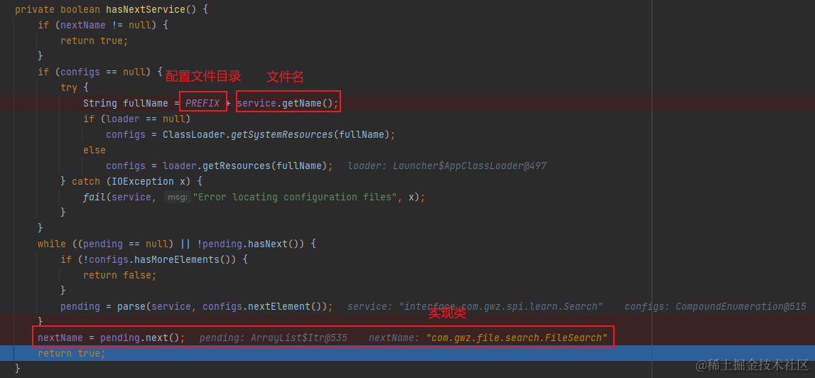 acc是一个安全管理器,debug 看值是null,所以看hasNextService()和nextService()方法就可以了。在hasNextService()方法中,会通过PREFIX + service.getName()来拼接一个资源路径URL,拼接这个URL的目的就是为了能供通过该URL获取文件中的内容,看到这里应该就明白了为什么实现SPI服务时,需要创建名为META-INF/services/的文件夹,以及以接口名命名的文件,这是由PREFIX与service.getName()决定的,那么下图中的实现类名称是如何来的呢?