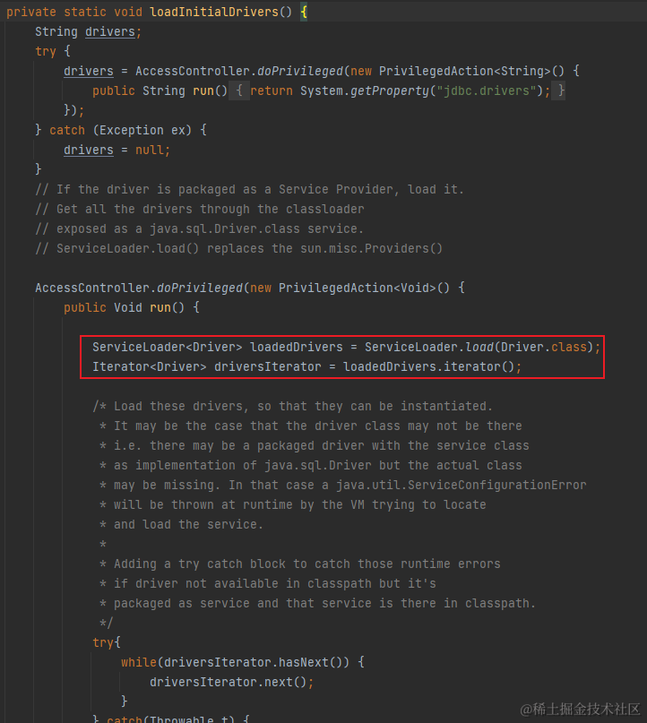 查看JDBC源码可知,驱动实现接口java.sql.Driver,然后通过registerDriver把当前driver加载到DriverManager中。查看DriverManager的源码,可以看到其内部的静态代码块loadInitialDrivers方法中使用了ServiceLoader: