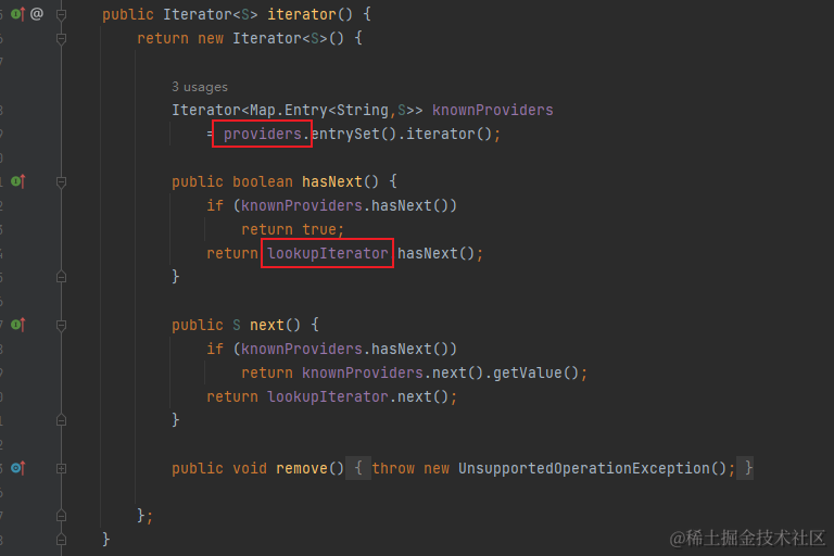 这里面有两个关键的东西,一是providers,在迭代器中会先从服务类缓存中查找服务类,若查不到就用lookupIterator查找。接着往下看LazyIterator的hasNext()和next()源码实现。