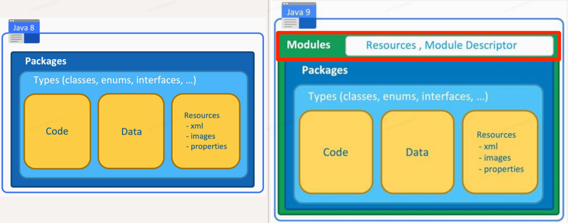 - JDK9以后引入了一个新组件module:模块描述符module-info.java,用于将一组相关的包放入一个组中。