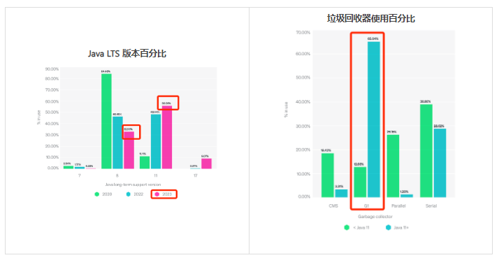 - 垃圾收集器使用情况来看,JDK11版本及以上 G1使用率最高,占比高达65%