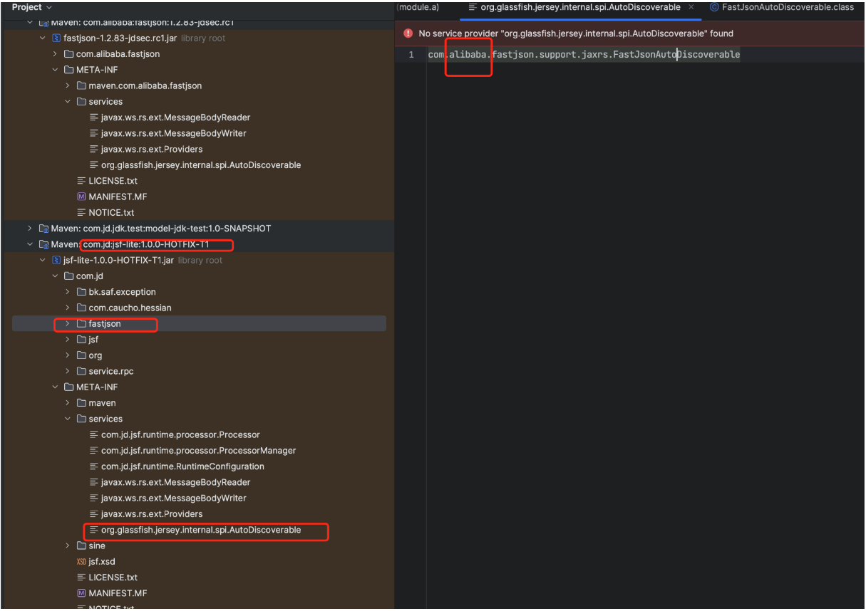 经过一系列定位研究,发现jsf-lite包中,/META-INF/services下的文件org.glassfish.jersey.internal.spi.AutoDiscoverable里面写的类是com.alibaba.fastjson.support.jaxrs.FastJsonAutoDiscoverable,此类并未在当前jsf.lite包中定义,属于com.alibaba.fastjson包的。
