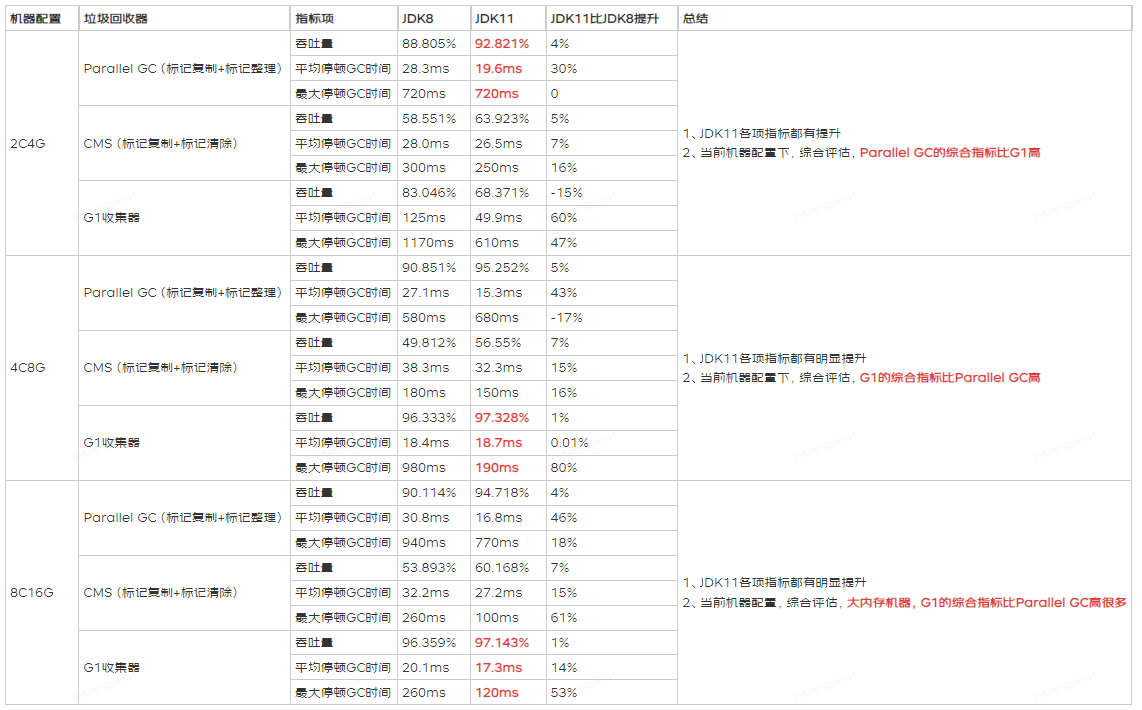 - JDK11相对于JDK8,所有垃圾回收器的性能都有提升,特别是大内存机器下G1的提升最明显