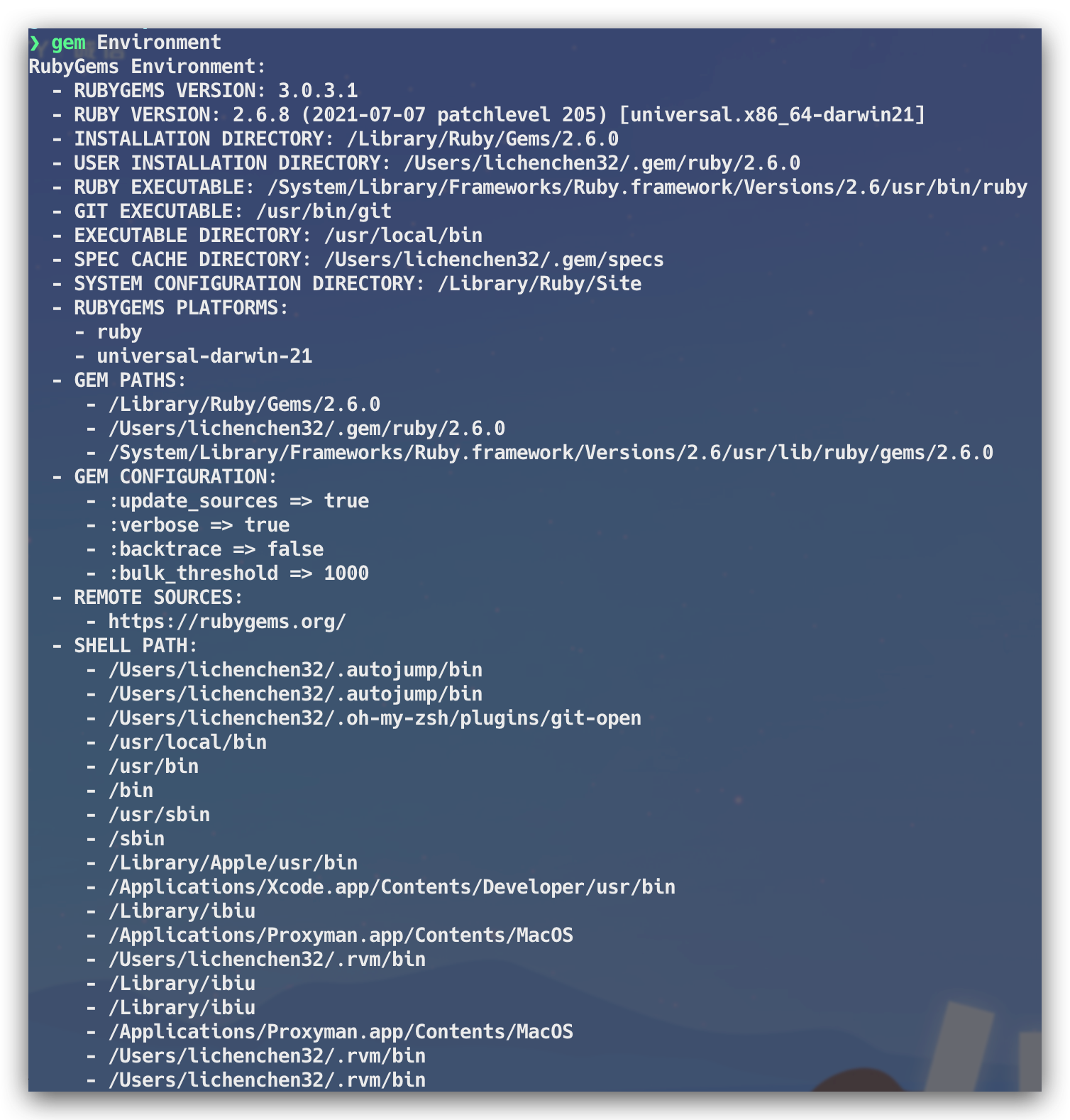 安装完成之后,就可以使用基于Cocoapods的 pod xxxx 相关命令了。gem install xxx 到底做了什么也能让 Terminal 正常的识别 pod 命令?gem的工作原理又是什么?了解这些之前,可以先看一下 RubyGems 的环境配置,通过以下的命令: