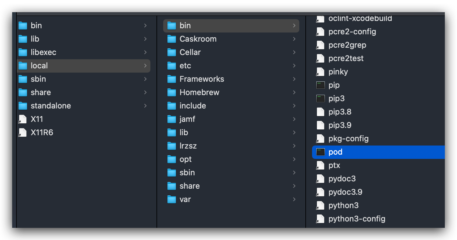 通过以上的命令,可以看到Ruby的版本信息,RubyGem的版本,以及gems包安装的路径,进入安装路径 /Library/Ruby/Gems/2.6.0 后,我们能看到当前的Ruby环境下所安装的扩展包,这里能看到我们熟悉的Cocoapods相关的功能包。除了安装包路径之外,还有一个 EXECUTABLE DIRECTORY 执行目录 /usr/local/bin,可以看到拥有可执行权限的pod文件,如下: