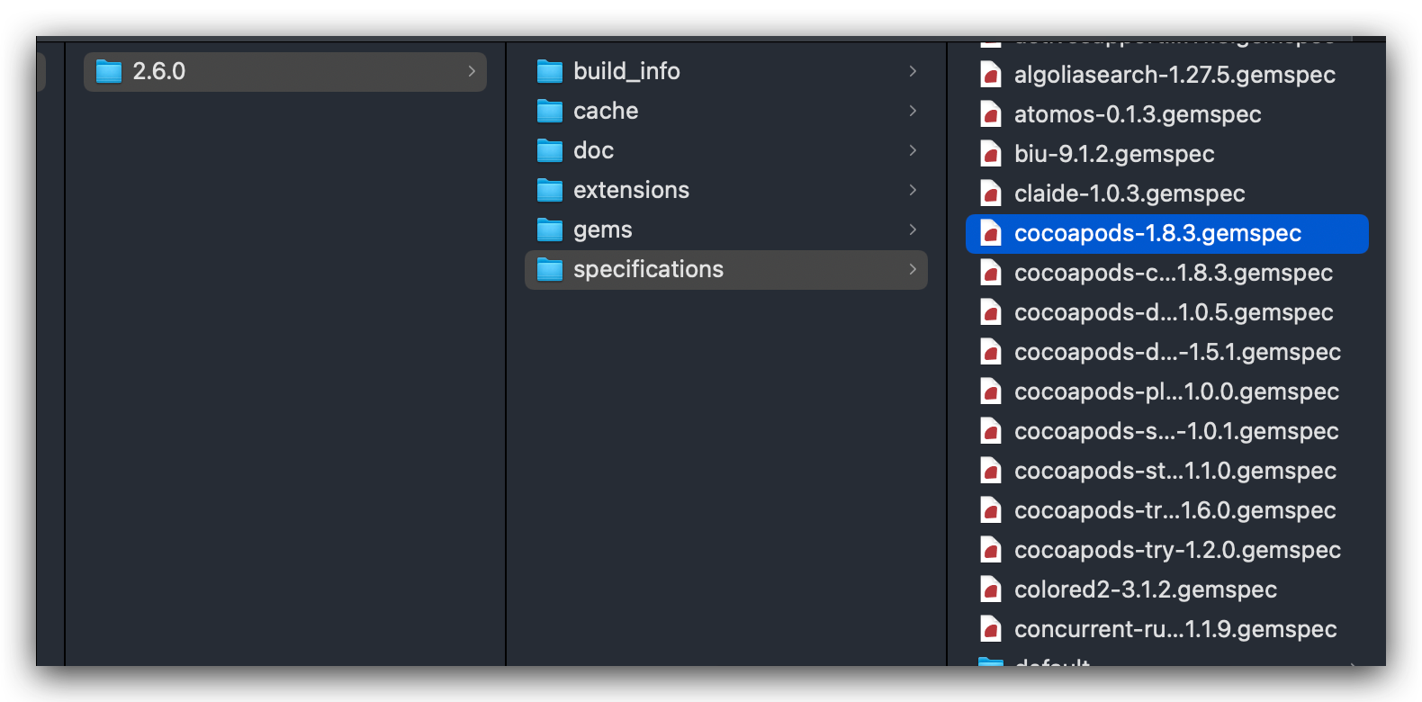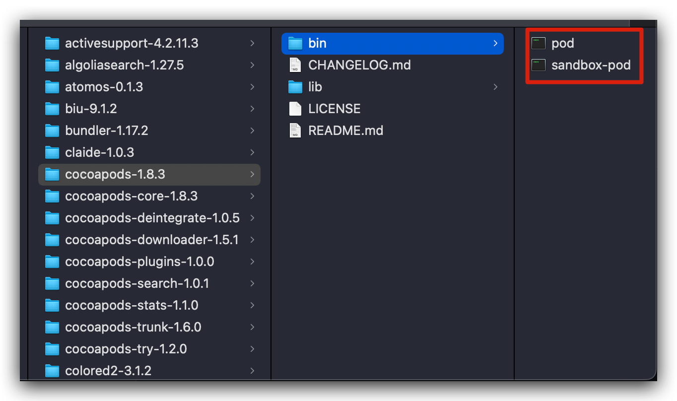 到这里,可以看出,pod命令本质是执行了RubyGems 的 find_spec_for_exe 方法,用来查找并执行gems安装目录下的bin目录,也即是 /Library/Ruby/Gems/2.6.0 目录下的gem包下的bin目录。而针对于pod的gem包,如下所示: