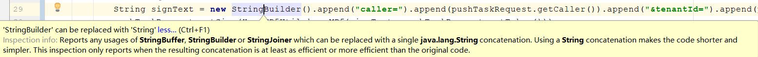 内容翻译:报告StringBuffer、StringBuilder或StringJoiner的任何用法,这些用法可以用单个java.lang.String串联来替换。使用字符串串联可以使代码更短、更简单。只有当得到的串联至少与原始代码一样高效或更高效时,此检查才会报告。
