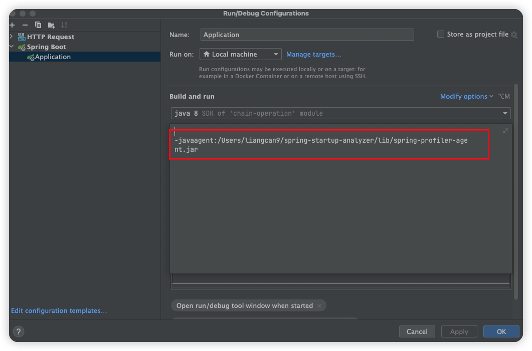 spring-startup-analyzer是以agent的方式启动的,所以在启动命令中添加参数-javaagent:安装路径/spring-startup-analyzer/lib/spring-profiler-agent.jar即可。