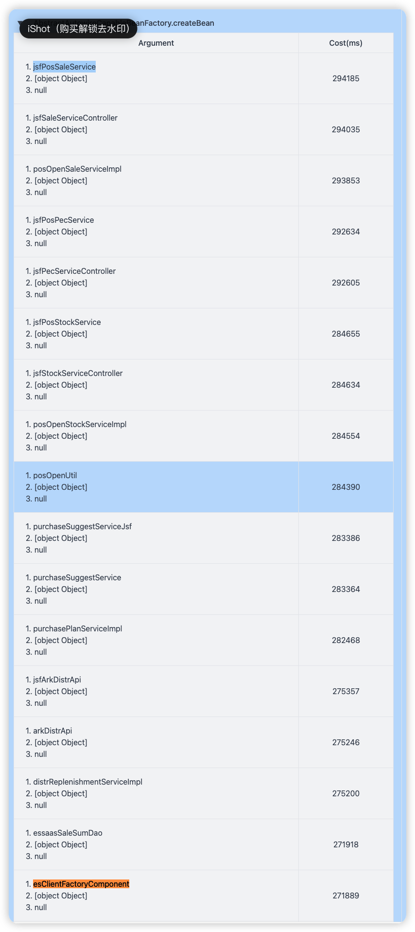 分析可以看到,耗时排名前面的接口都是jsf相关的加载,还有一个es相关的bean。