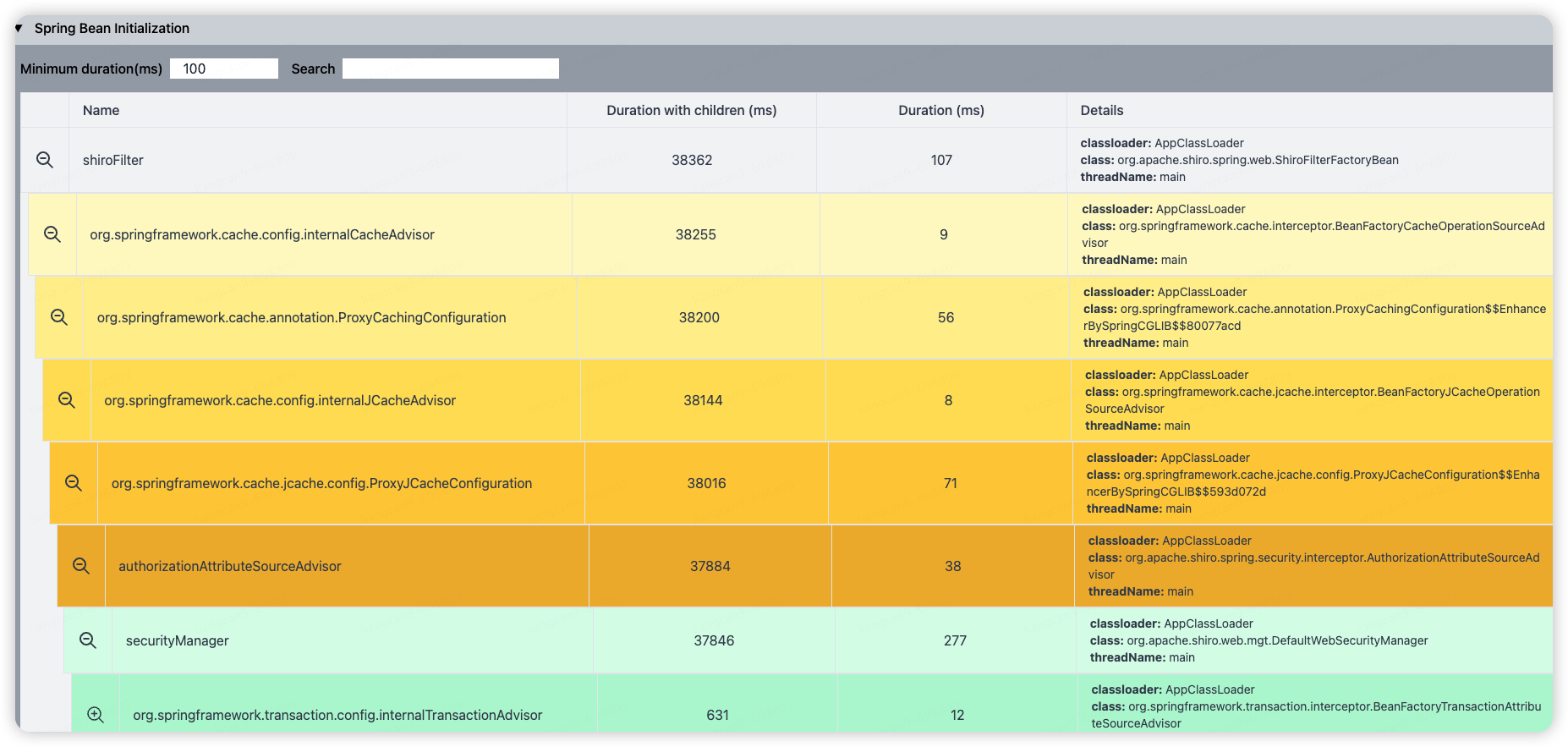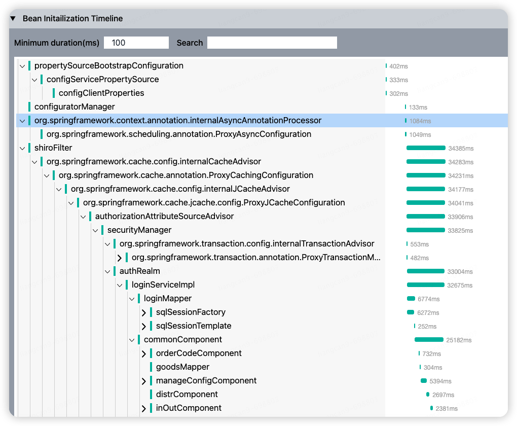 - 优化慢速的Bean初始化:找到启动耗时较长的Bean。可以考虑对这些接口和Bean进行优化,例如使用延迟加载或异步加载的方式,以减少启动时的耗时。