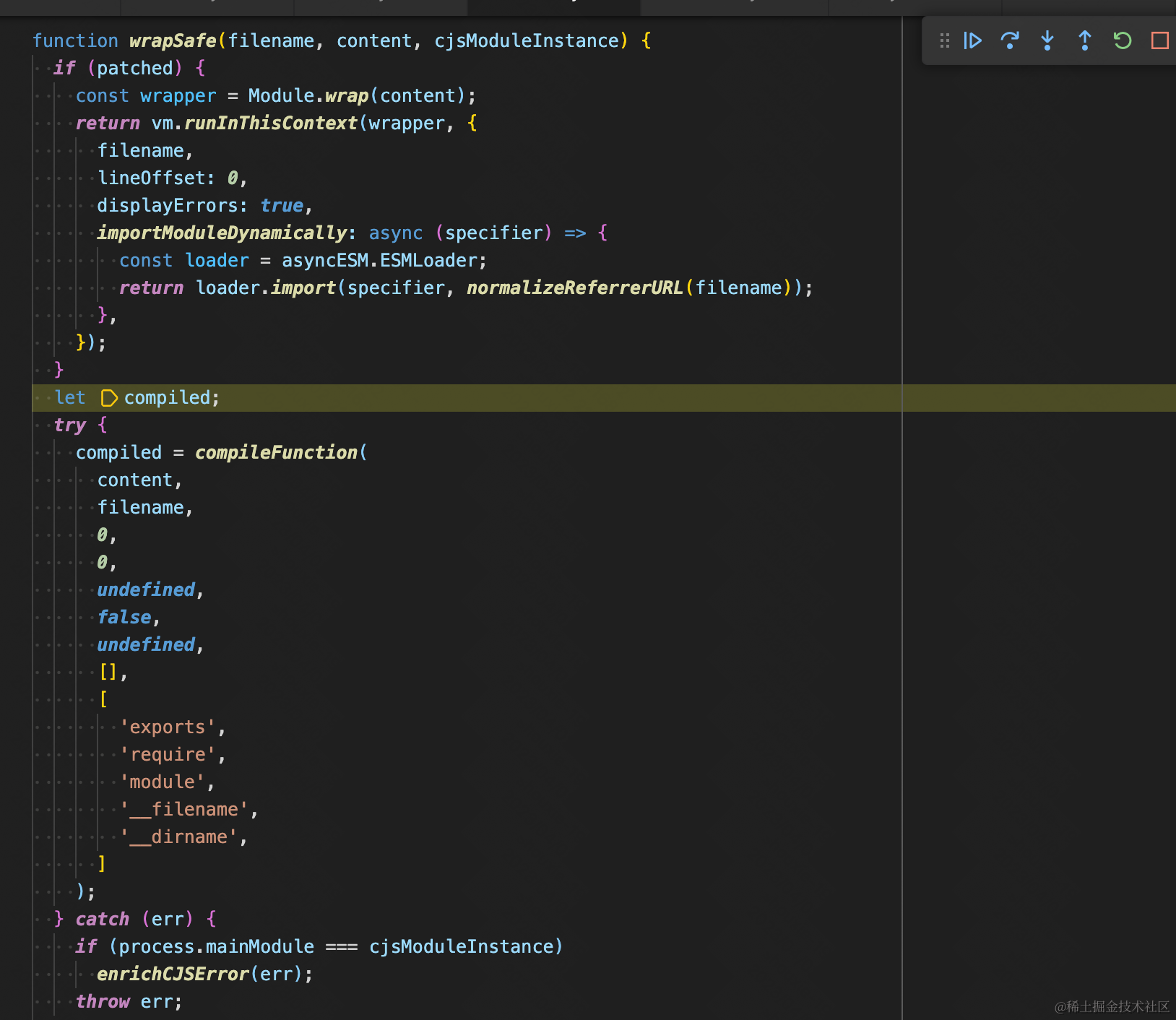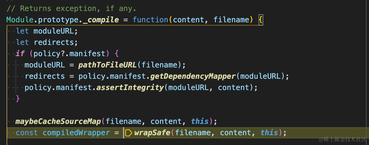 6.此方法中执行wrapSafe方法。将字符串前后添加函数前后缀,并用Node中的vm模块中的runInthisContext方法执行字符串,便直接执行到了传入文件中的console.log代码行内容。