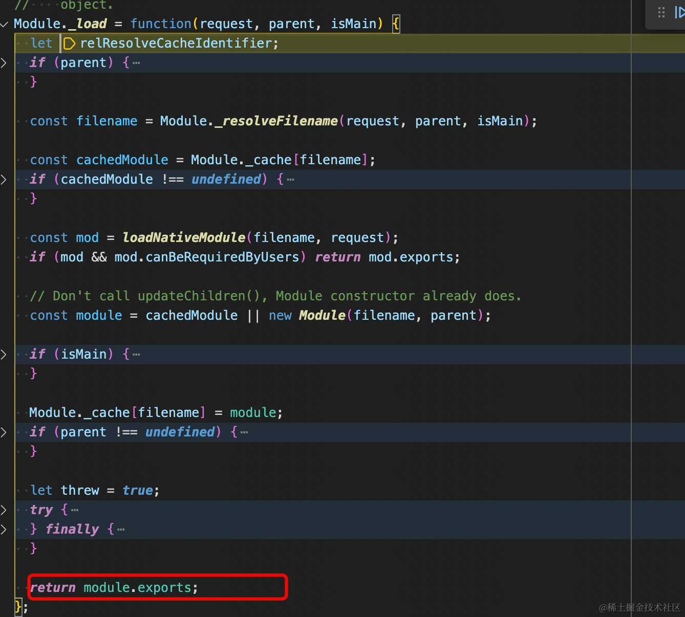 最终将加载到的模块挂载module.exports中。tryModuleLoad执行完毕之后module.exports已经存在了,直接返回就可以了。