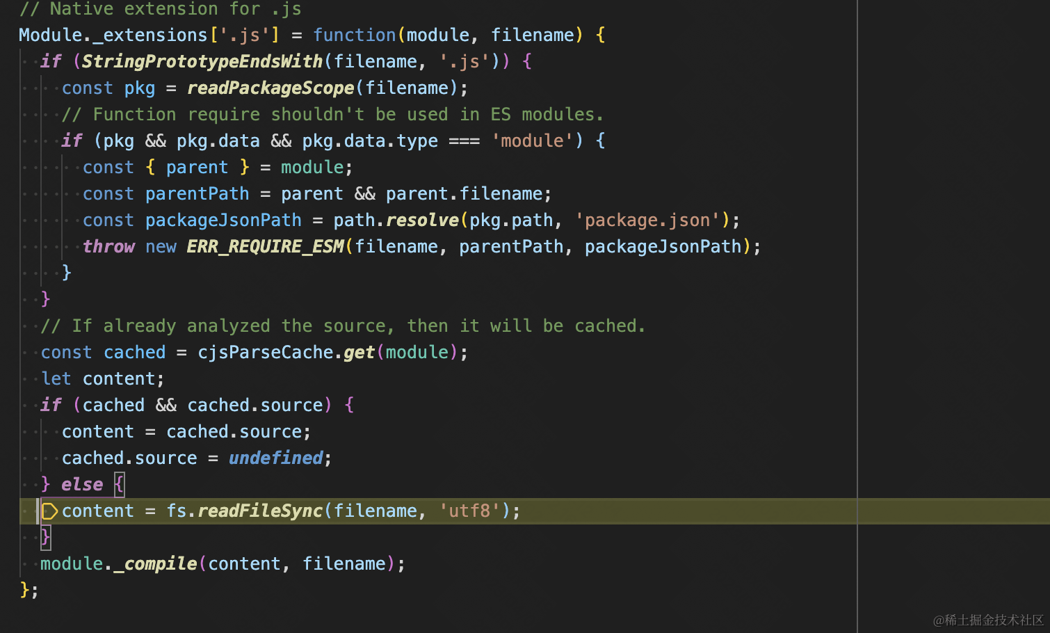 5.进入到该方法中,看到了核心代码,读取传入的文件地址参数,拿到该文件中的字符串内容,执行module._compile