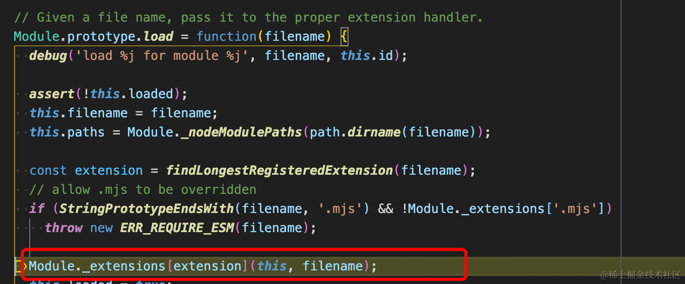 4.接着调试到module.load 方法,该方法中使用了策略模式,Module._extensions[extension](this, filename)根据传入的文件后缀名不同调用不同的方法