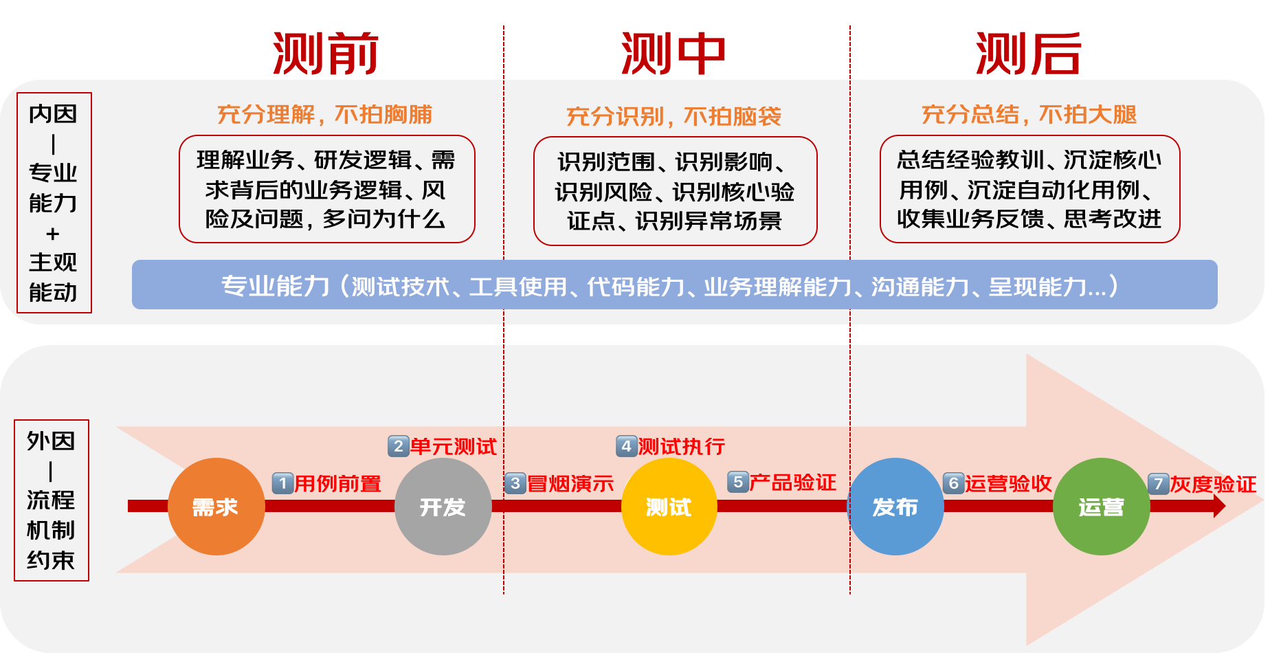 •**测后:充分总结,**不惊慌拍大腿懊悔。测试完成及上线不是终点,除了配合业务进行线上验证及观察线上数据、进行线上巡检之外,还应花点时间回顾一下交付的过程,总结经验教训,主动分享。对于核心的用例,看能否沉淀为自动化的回归及巡检用例。万一出现了线上问题,先尽快恢复业务,再分析原因,进行复盘,总结教训和改进方案。