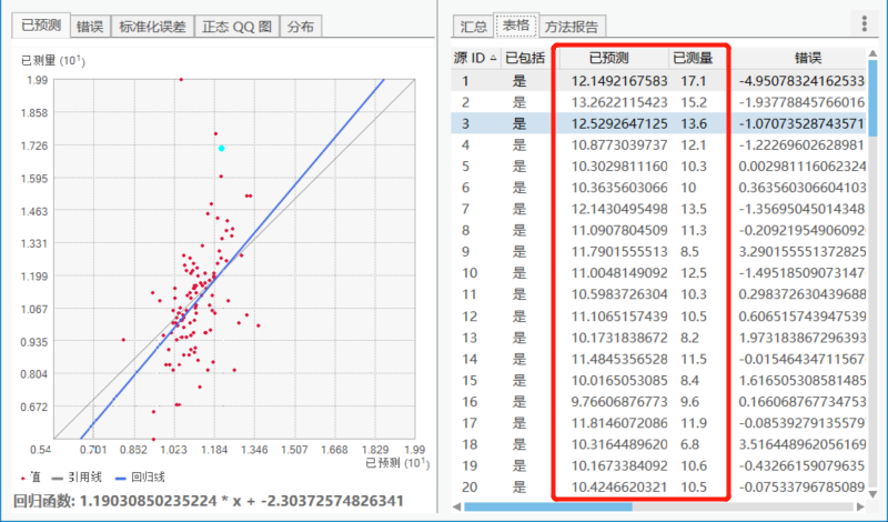各散点的x、y轴信息对应于右侧表格中的已测量和已预测数值。