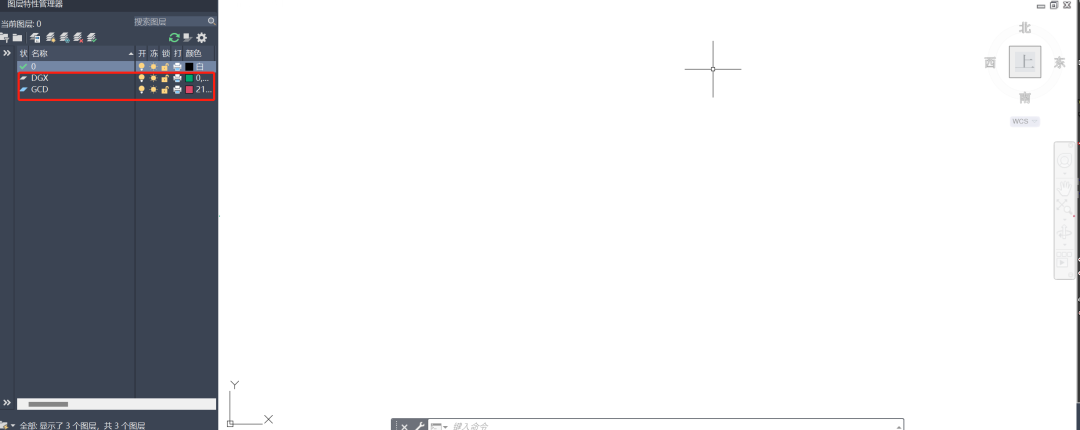 但是上述数据如此操作后,好像没有变化,使用ZOOM命令后,看上去整个屏幕都是空的,但确实显示两个图层都在了: