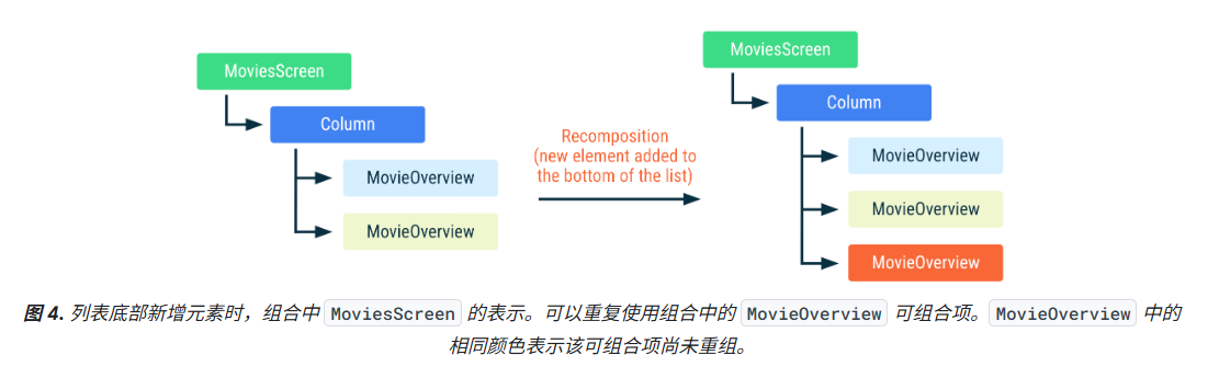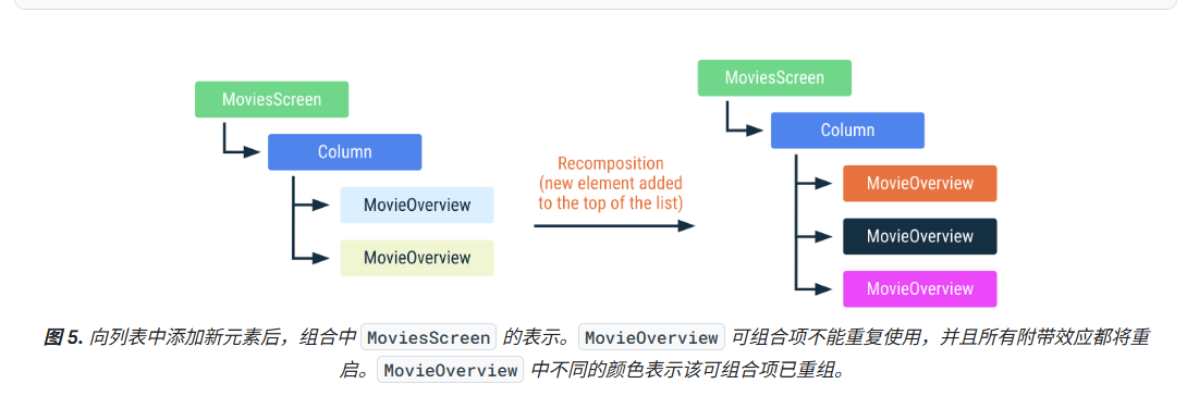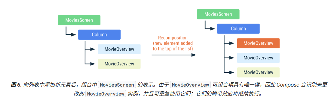 但是在列表底部新增了一个 movie 就不会出现这样的问题,Compose 可以重复使用组合中既有的实例,因为这些实例在列表中的位置没有发生变化,因此这些实例的 movie 输入是相同的。