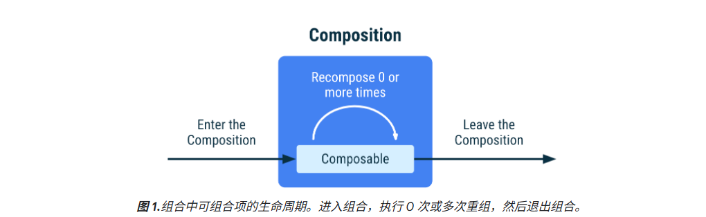 - 可组合项生命周期:进入组合 → 0 次 / 多次重组 → 退出组合;