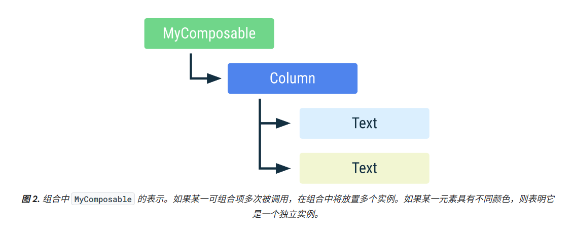 另外,如果一个可组合项被多次调用,那么每个调用都会在组合树里生成一个独立的实例,每个实例都有自己的生命周期,互不干扰。比如在 Column 里放了两个 Text,它们就是两个独立的可组合项实例,一个的状态变化不会影响另一个的生命周期。