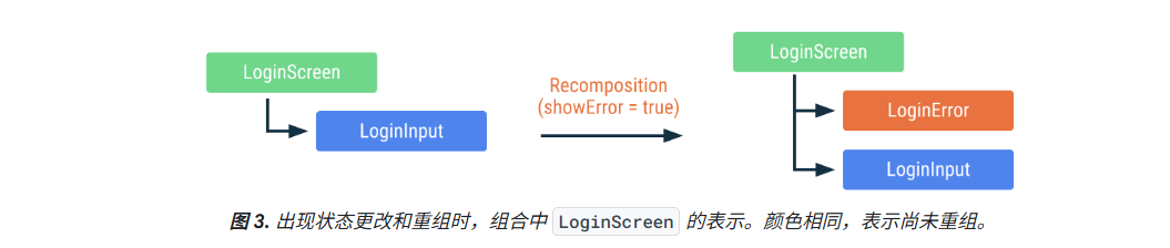 例如,在 LoginScreen 里有个条件判断:当 showError 为 true 时显示 LoginError,而 LoginInput 始终显示。当 showError 从 false 变成 true 时,LoginError 会 “进入组合”,但 LoginInput 的调用点没变,所以它的实例会被保留不会重新创建,如果 LoginInput 的任何参数都没有变化,Compose 将避免重组这些可组合项,即跳过 LoginInput 的重组。
