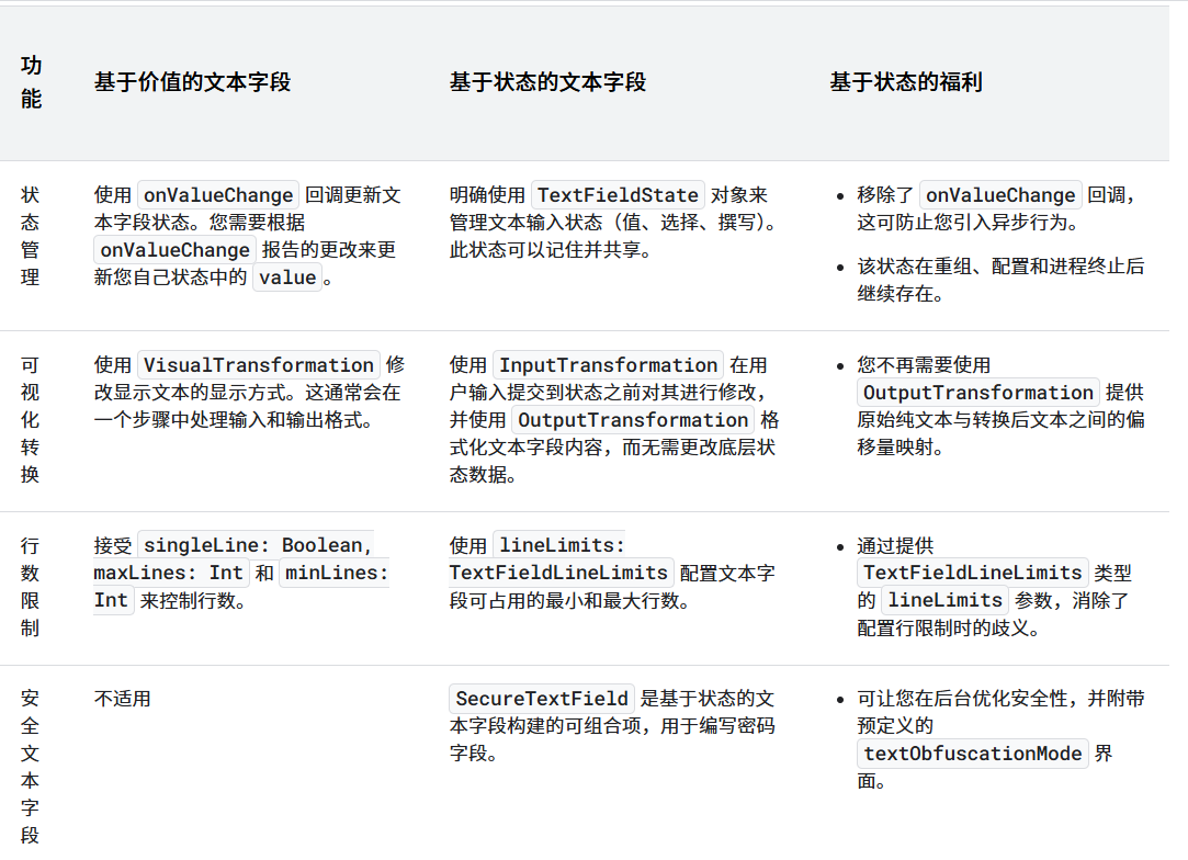 - TextField:分基于值(用 mutableStateOf)和基于状态(用 rememberTextFieldState)两种实现。