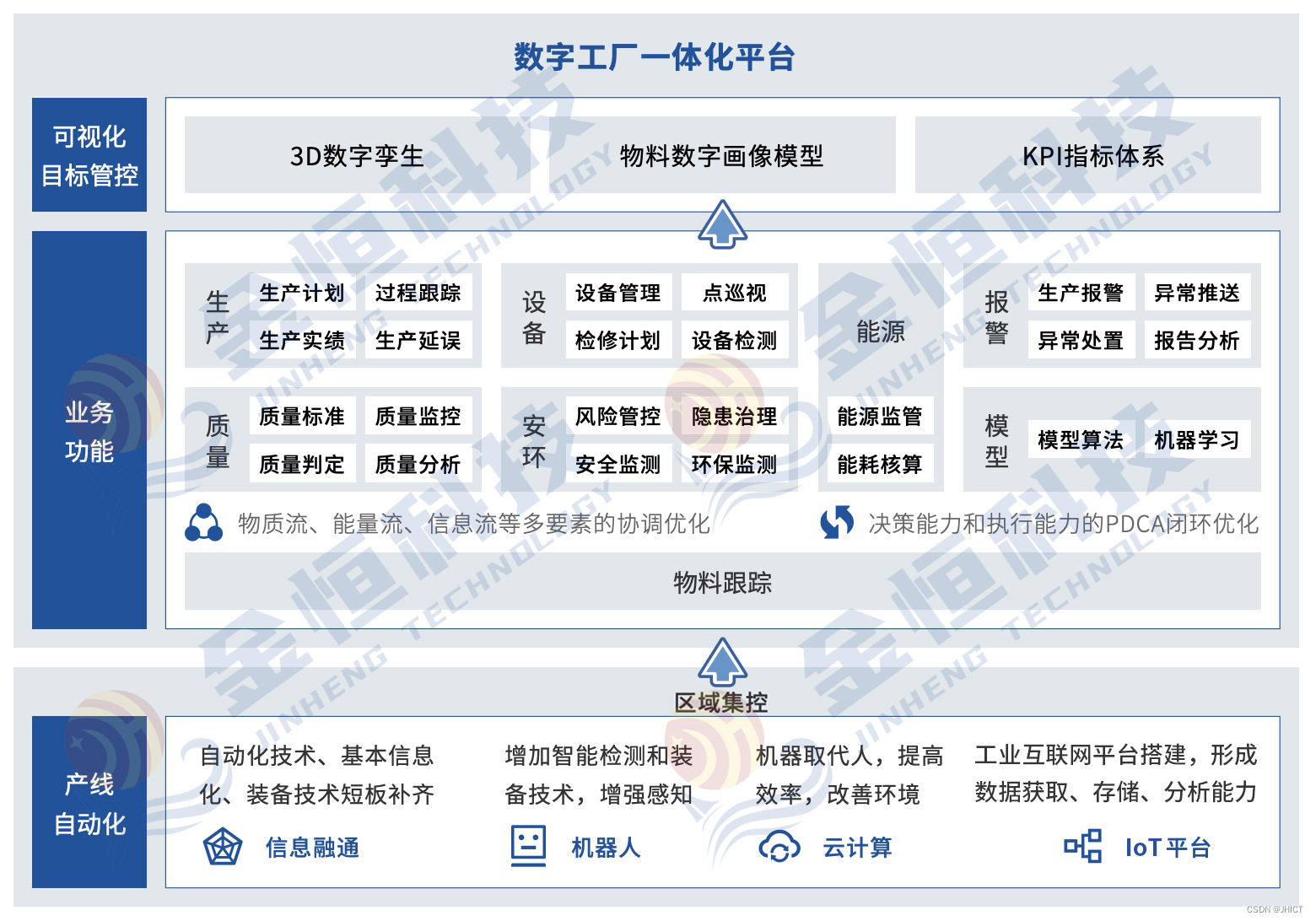 秉承“数字化转型生态构建者”的企业愿景,金恒科技全面提供数字工厂规划咨询、设计与实施服务。金恒数字工厂一体化平台,基于数字孪生、人工智能、物联网等技术,以海量数据为基础,建立规则和机理模型,对生产、质量、设备、能源、安全等场景进行映射,实现生产过程的全局感知、实时监控和精准控制,通过多维度的数据抽取、分析和整合,推动生产执行、工艺分析和管理决策的效率提升。