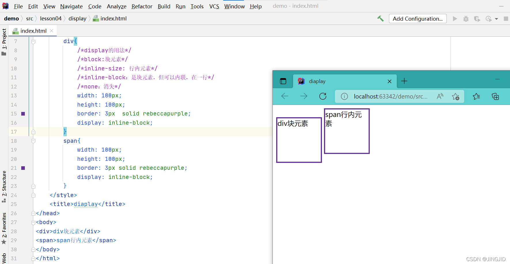 display的用法: block:块元素 inline-size: 行内元素 inline-block:是块元素,但可以内联,在一行 none:消失