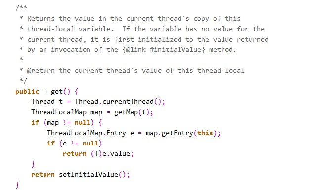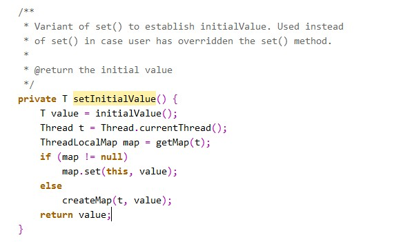 因为在上面的代码分析过程中,我们发现如果没有先set的话,即在map中查找不到对应的存储,则会通过调用setInitialValue方法返回i,而在setInitialValue方法中,有一个语句是T value = initialValue(), 而默认情况下,initialValue方法返回的是null。