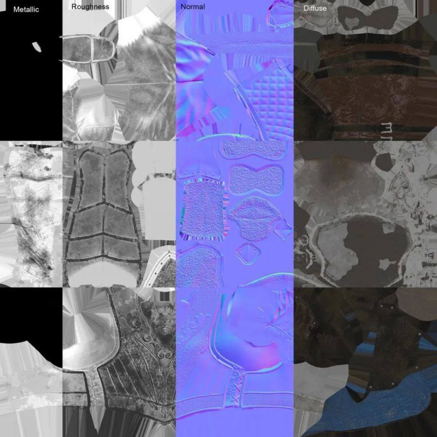 在通过各种微调、细节优化后,便开始了贴图的绘制,这也是游戏美术风格、角色美术细节体现的部分,除了要用到大量的高清素材,还需要设计者手绘进行原创制作,次世代游戏则会结合以上的贴图,以达到更好的角色质感和表现效果。