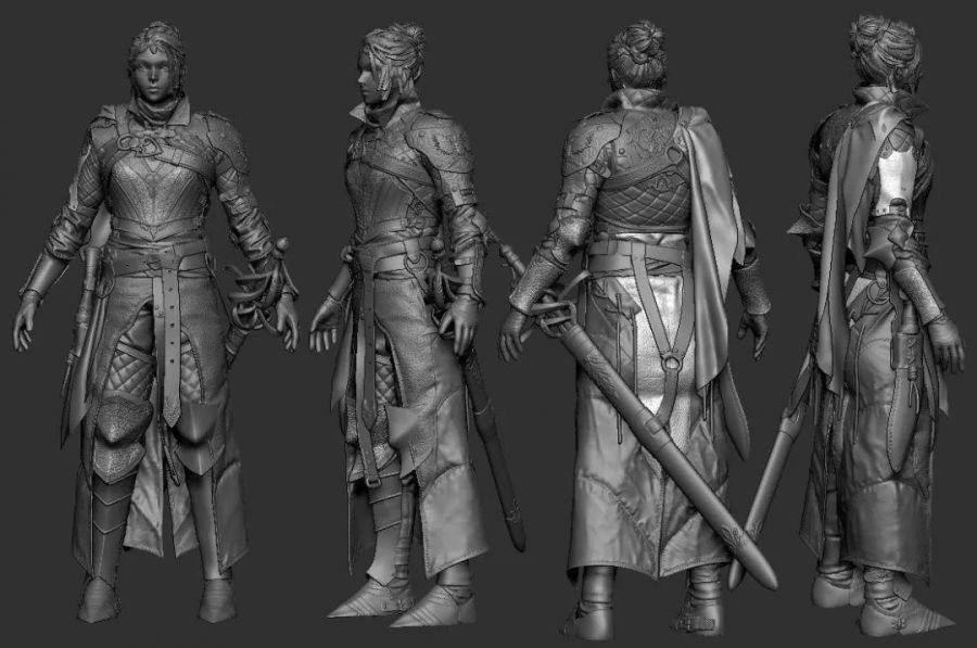 当游戏角色原画及设定确定后,会进行角色模型制作。次世代角色模型制作流程一般是:3Dmax建中模-ZB雕刻高模-maya拓扑低模-mayaUV拆分-toolbag或SP烘焙贴图-SP绘制材质。