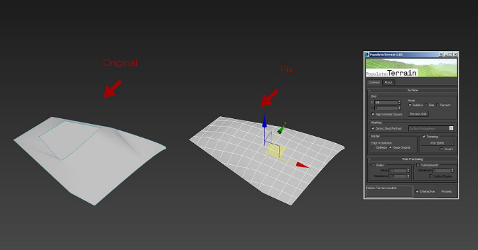 在使用3ds Max进行建模的时候,可以选择‘多边形编辑’(Edit Poly)。(Edit Mesh)在制作中没有适合的工具。然后在渲染的时候会出现奇怪的法线(normal)导致轮廓等地方没有达到想要的效果。我个人比较喜欢的工具是,地形以及其他的物品在进行修正上使用的Populate Terrain 脚本」