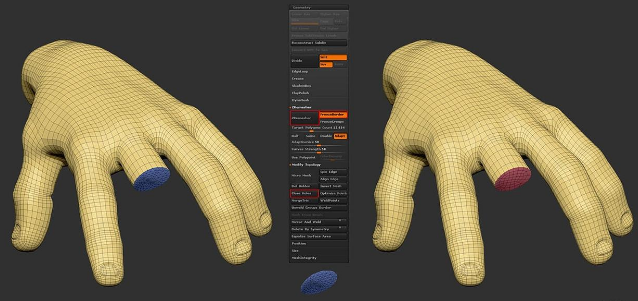 使用「ZBrush 的[Close Holes]([Modify Topology]菜单)来封闭几何的孔洞。三角型在雕刻建模中的调整较为复杂,简单的修正也可以成为最好的方式。