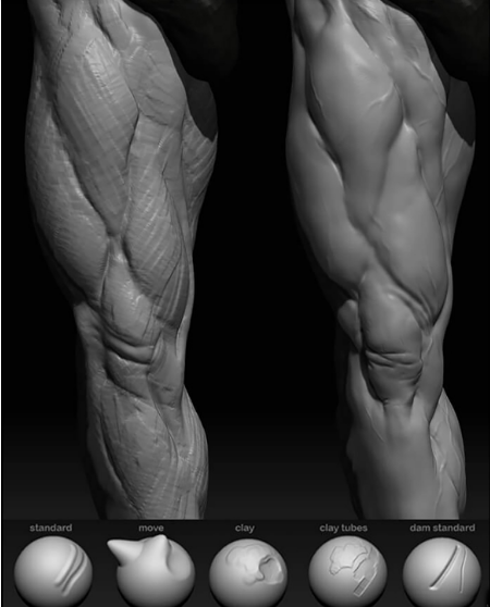 在建模中,尽可能将使用工具的数量缩减到最小。我一般只会使用Zbrush的[Standard][Clay][Clay Tubes][Move][Dam_Standard]首先使用[Clay Tubes]笔刷来制作形式与构造。再使用[Dam_Standard]笔刷进行雕刻,就可以很好的表现出形状。