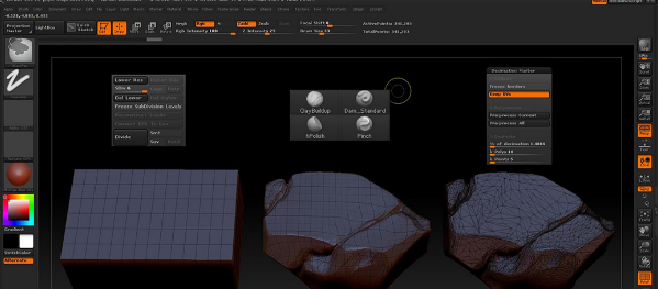 「ZBrush 是使用雕刻建模制作有机模型时才能发挥出效果的工具。现在在制作岩石这样的物品时,使用ZBrush中基本的球(sphere)和ZSphere来直接进行制作。基地初具规模完成之前,重复使用DynaMesh后,在用追加变形的使用。这是制作非破坏目的里最为优秀的制作流程。