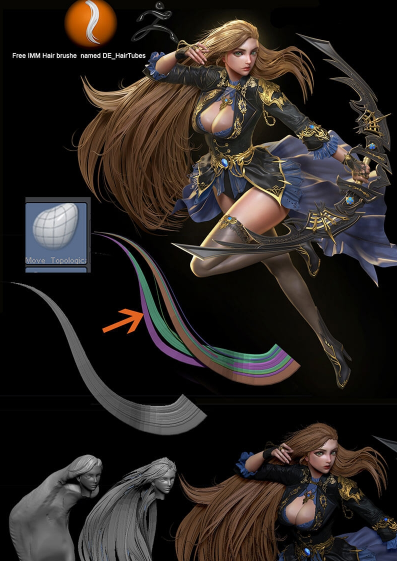 我使用的IMM头发可以从gumroad免费下载。 我最开始使用dynamesh的基本网格,然后开始添加发线,并一直在上面下功夫,以增加更多的动作。 我还使用移动拓扑来添加线,因为在IMM刷中您可以使用的是一组头发,头发的关键是使它们有足够的重复性和可操作性,反复可以获得最好的结果。